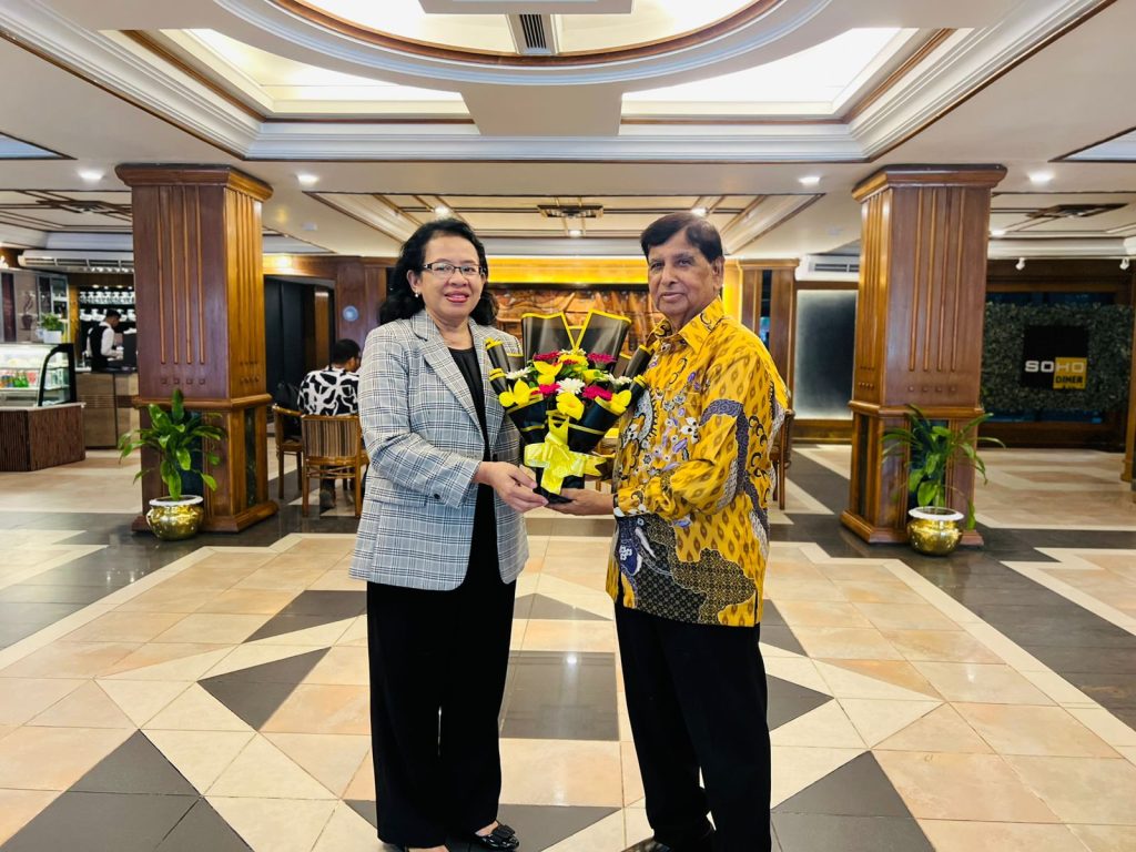 Mr. H. M. Hakim Ali, Managing Director of Hotel Agrabad & Father of Tourism in Bangladesh, presents a bouquet to H.E. Ms. Listyowati ,Ambassador of the Republic of Indonesia to Bangladesh during her first official visit to Chattogram at Hotel Agrabad.