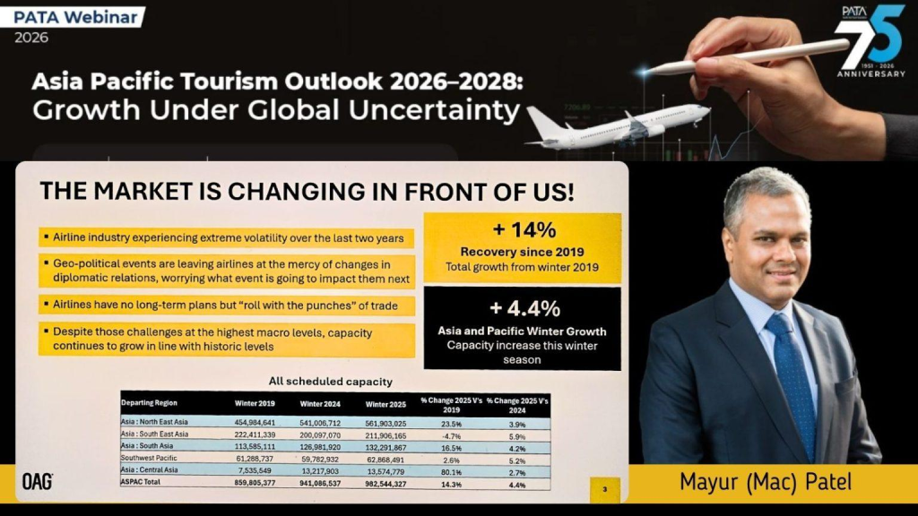 The Asia Pacific aviation market is entering a new phase of expansion, marked by strong recovery, structural volatility and intense competition. Speaking during PATA’s Live Webinar “Asia Pacific Tourism Outlook 2026–2028: Growth Under Global Uncertainty”, Mayur (Mac) Patel, Commercial and Industry Affairs Leader, Asia Pacific, Middle East and Africa, OAG, outlined a market that is outperforming pre-pandemic benchmarks but facing mounting profitability constraints.