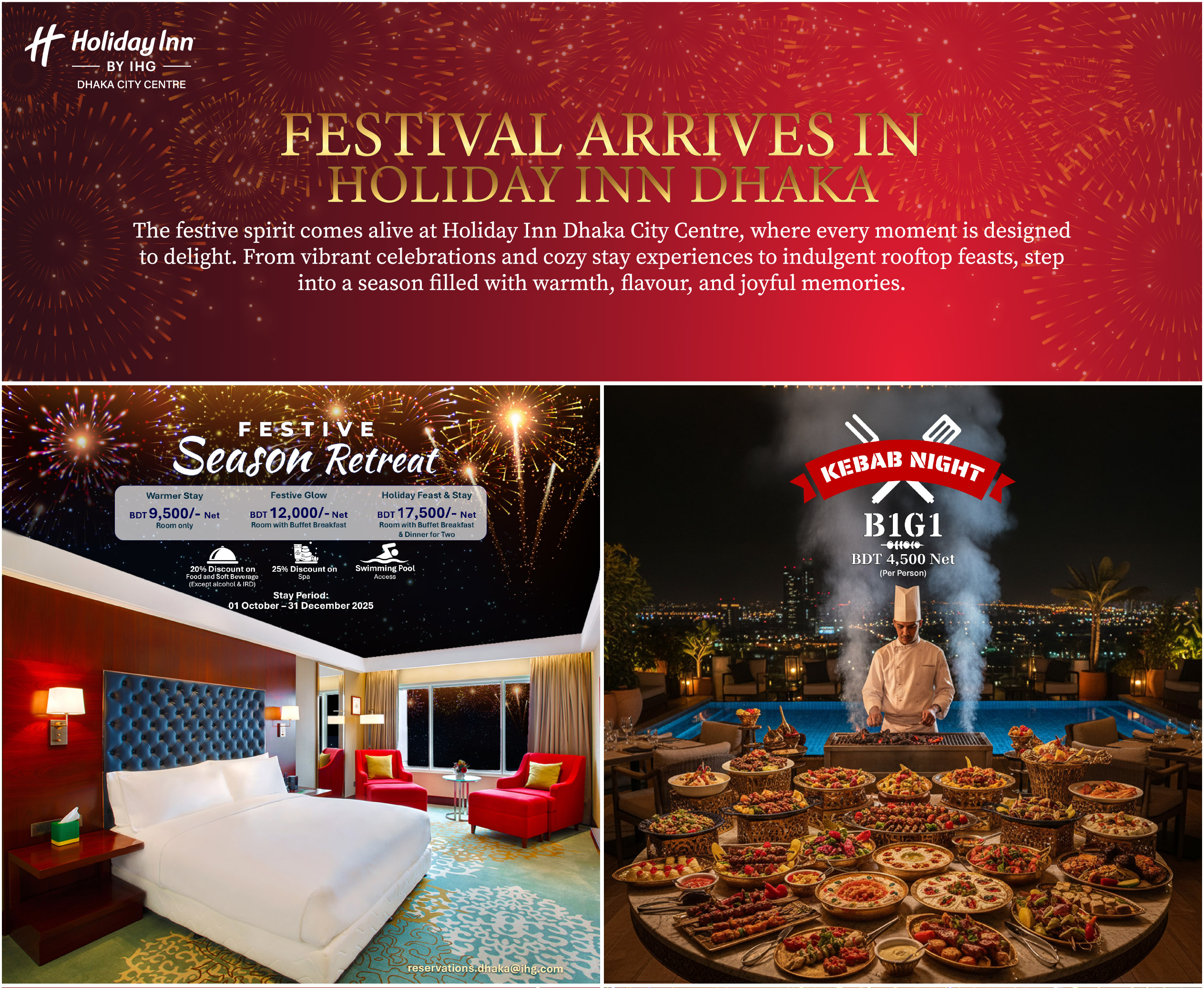• Festive Season Retreat: Escape the everyday with a cozy Holiday Escape in the City. Exclusive stay packages start from just BDT 9,500 net, including festive dining options and access to the spectacular rooftop infinity pool.