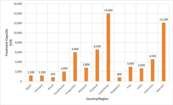 In terms of treatment capacity, Uzbekistan ranks first, with a total designed capacity of 14,000 tons per day across 7 projects. Vietnam also surpassed the 10,000-tonnes-per-day scale, following closely with a processing capacity of 12,100 tons per day.